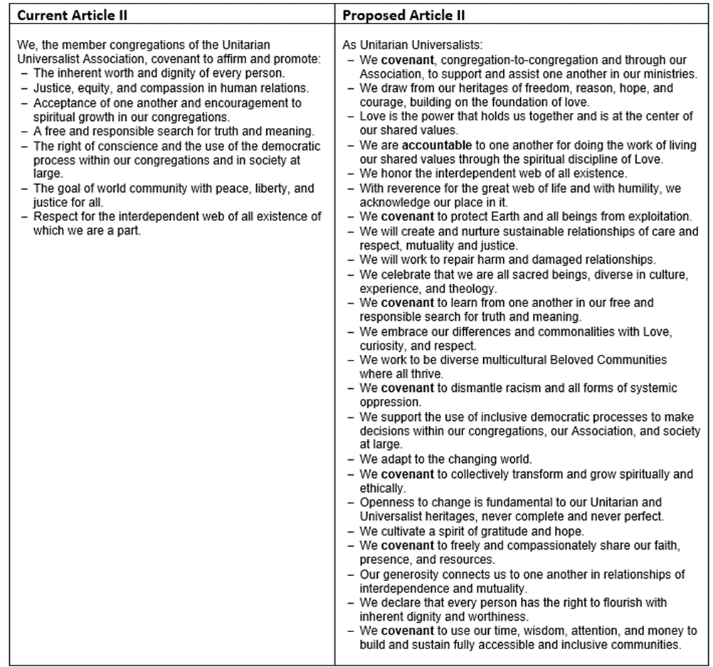 Let us not forget that individual Freedom of Belief, commitment to spiritual growth, and a peaceful world community are hallmarks of Unitarian Universalism’s unique identity as a liberal faith. The Article II proposal is taking all that away.