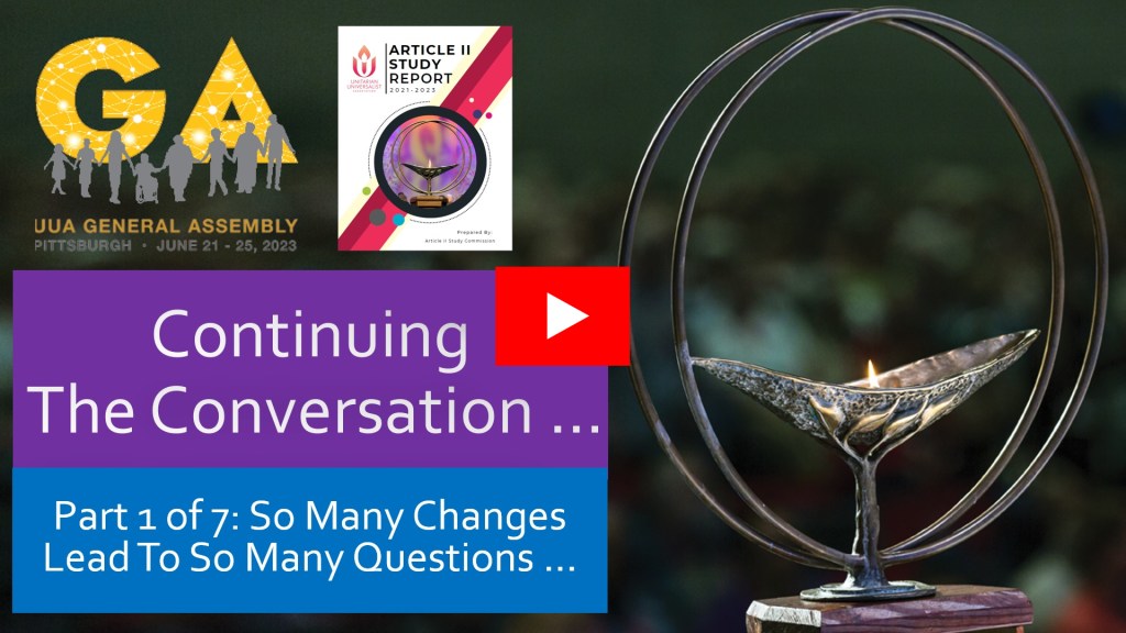 This is part 1 of a 7-part video series about the proposed revision of Article II of the Unitarian Universalist Bylaws. When this proposal was preliminarily approved at General Assembly last June, the consistent refrain from UU leaders and delegates was that they were voting to continue the conversation about what UU is going to be about. In Part 1, we find that so many changes lead to so many questions. (Length: 8:30)